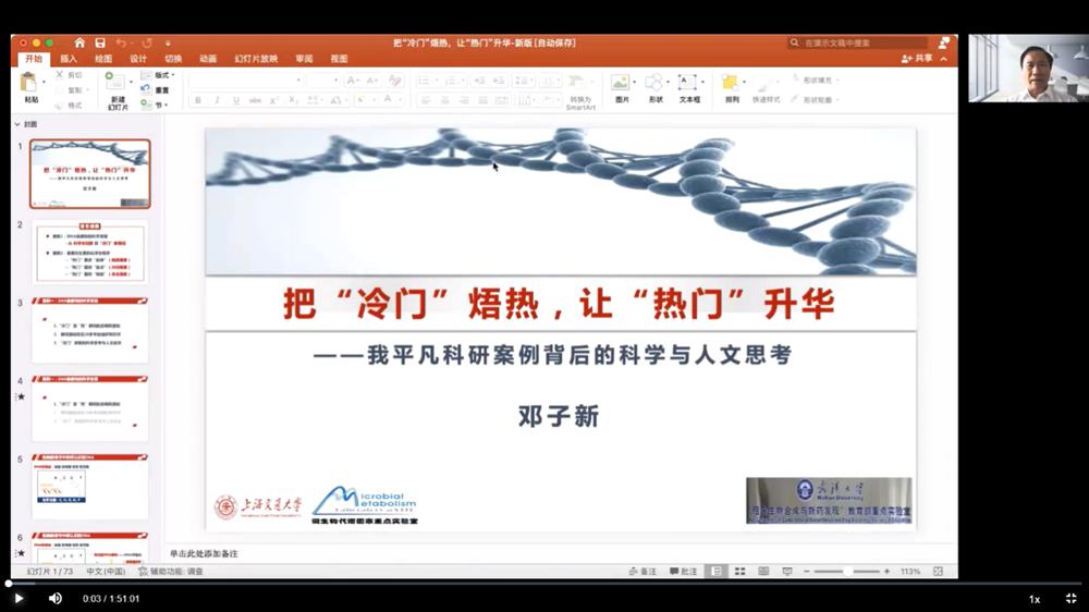 之后,邓子新教授又介绍了热门领域的研究,从三个对我国和世界作出重大贡献的抗生素南昌霉素、井冈霉素和杀念菌素的研究和应用出发,总结提出针对热门领域要“求延伸、找盲点、挖瑕疵”,抓住这三点就能在热门领域有所斩获,没有任何东西是无懈可击的。最后,他结合冷门和热门研究方面的经验,提出学生创新能力的培养要重过程,成才需要做到“勤奋、踏实、合作、沟通”。