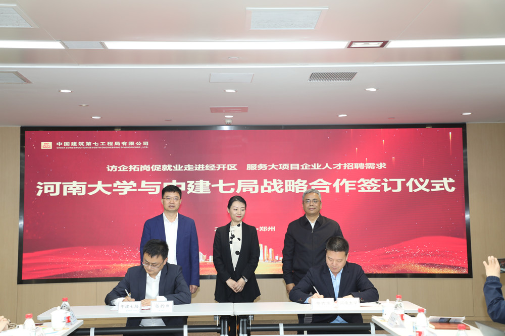 为落实教育部关于高校领导访企拓岗促就业工作部署和省委工作会议提出的“十大战略”任务,贯彻楼阳生书记在全省三个一批重点项目启动仪式上讲话精神,深入推进校企合作,助力企业高质量发展要求,4月28日上午,校党委书记卢克平及校党委办公室、就业创业指导中心、商学院、人工智能学院、文学院等职能部门和学院负责人一行走进郑州经开区中国建筑第七工程局有限公司。双方签订战略合作协议,并举办“加速推进创新驱动、科教兴省、人才强省战略”论坛。活动由河南大学、河南日报、中国建筑第七工程局有限公司主办,河南大学就业指导中心、中原发展研究院、中建七局四公司承办。郑州经开区管委会副主任刘丹,中建七局党委书记、董事长方胜利,河南日报郑州记者站副站长杨凌等领导出席活动。
