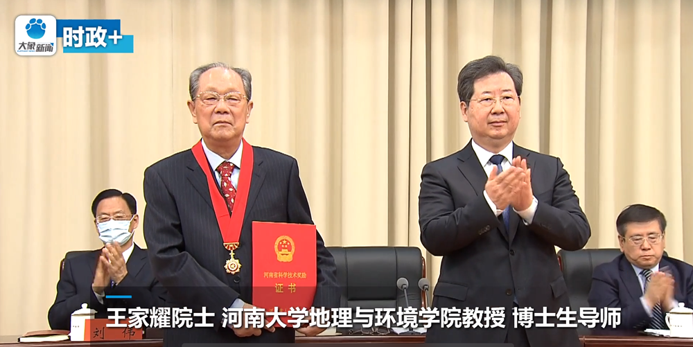 4月29日上午,全省教育科技创新大会暨人才工作会议在郑州召开。省委书记楼阳生为2021年度河南省科学技术杰出贡献奖获得者,河南大学王家耀院士颁发奖章和证书。