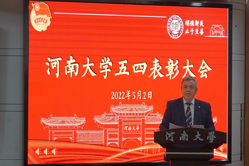 卢克平代表学校党委向全校青年教师、青年学生、青年工作者致以节日的问候!向受到表彰的先进集体和先进个人表示热烈的祝贺! 2022年,是我们党的二十大召开之年,是中国共青团建团100周年、河南大学建校110周年、我校落实“双航母”、建设“双一流”的崭新起点,更是学校继往开来、再谱华章的奋进一年,他希望全校团员青年以习近平新时代中国特色社会主义思想为指导,深刻领悟习近平总书记在中国人民大学考察调研时的重要讲话精神。他勉励河大青年要继承和发扬五四精神,一是把握时代机遇,勇挑重担,做新时代的开拓者。新时代青年人有着更加广阔的舞台,既面临着建功立业的难得际遇,也面临着“天将降大任于斯人”的时代使命。面对时代的问卷,无论是学术科研、创新创业还是志愿服务、社会实践,河大青年总是冲在第一线,战在最前沿,用实际行动展现了当代青年的奉献精神和责任担当。希望同学们树立远大理想,把握时代机遇,将“小我”融入“大我”,从党的百年奋斗中感悟信仰的力量,以实现中华民族伟大复兴为己任,不辜负党和人民期望,不辜负伟大祖国和伟大时代,用信仰之光照亮奋进之路,用担当实干践行初心使命;二是珍惜学习时光,全面发展,做新时代的奋进者。希望同学们能将学习作为一种责任、一种精神追求、一种生活方式,树立“立志而圣则圣矣,立志而贤则贤矣”的高远志向,练就“学如弓弩,才如箭簇”的过硬本领,保持“志之所趋,无远弗届”的拼搏劲头,铸就真信仰,学好真本领,实现新梦想。树立“梦想从学习开始、事业靠本领成就”的观念,让勤奋学习成为青春远航的动力,让增长本领成为青春搏击的能量,向“摆烂”和“躺平”说不,用奋进书写有意义的人生,让青春之花在河南大学这片沃土的滋养下炫丽绽放;三是胸怀世界,自信开放,做新时代的领航者。希望同学们既能坚定对马克思主义的信仰和对中国特色社会主义共同理想的追求,深刻感悟马克思主义的真理力量,又能做到视野广阔,思想解放,认清世界发展大势,准确把握“两个大局”,做到胸怀世界、敢于创新,坚持向上向善的价值追求,勇当开路先锋、争当事业闯将,为国家发展进步而奋斗担当,为世界和平贡献智慧力量。他强调,全校团员青年应当牢记习近平总书记的嘱托,将建党百年积淀的红色基因与河大精神充分结合,以实现中华民族伟大复兴的中国梦为己任,不负韶华、不负时代、不负人民,在一代代河大人开拓的赛道上踔厉奋发、笃行不怠,跑出新时代河大青年的最好成绩,为开启我校“双一流”建设新征程贡献青春力量!