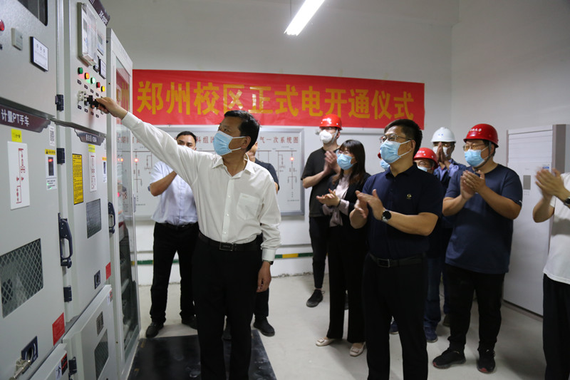 孙功奇宣布郑州校区正式电开始启用并推动校区配电室“总控开关”,伴随着现场热烈的掌声,配电室各电柜指示灯依次亮起,校区正式电顺利接通。