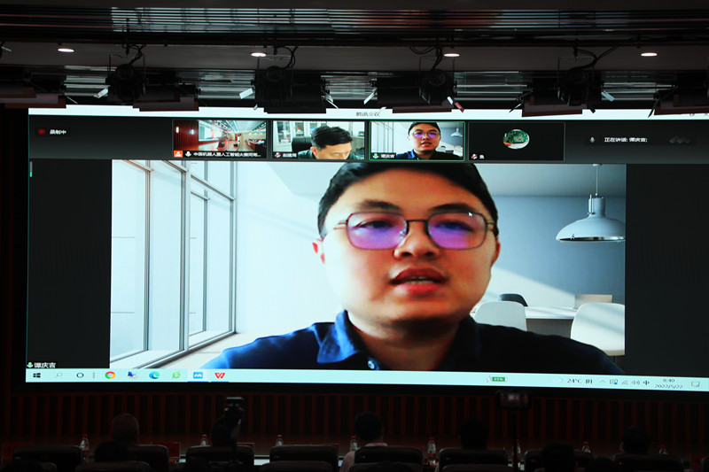 河南大学迈阿密学院2020级本科生王宇恒代表参赛选手发言。他表示,比赛对他们来说是一种挑战,同时也是机遇,在比赛的准备工作中,学生的创新精神、协作能力都得到了锻炼。他代表所有学校的参赛队员向比赛的主办方、领导及评委表达了诚挚谢意。