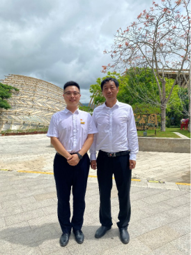 李文辉(左)与袁隆平先生家人代表、杂交水稻国家重点实验室副主任袁定阳(右)合影留念