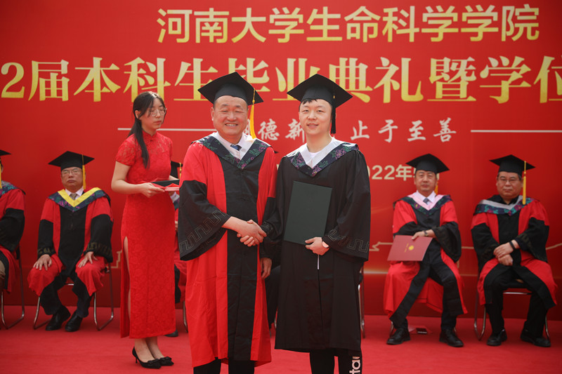 伴随着雄壮的国歌声响起,全体与会人员起立行注目礼,毕业典礼拉开帷幕。生命科学学院执行院长王刚宣读《关于表彰2022年河南省优秀应届大中专毕业生的决定》《河南大学关于表彰2022年优秀应届毕业生的决定》。学院副院长赵海鹏宣读《生命科学学院关于授予普通本科毕业生学士学位的决定》。