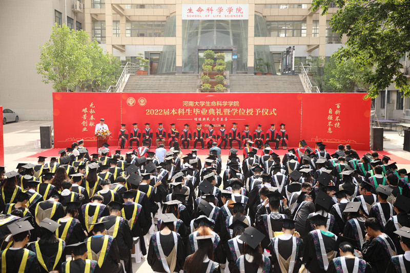 5月27日上午,生命科学学院2022届本科生毕业典礼暨学位授予仪式在学院楼前广场举行。校长宋纯鹏,校党委副书记张宝明,副校长王学路,副校长、生命科学学院院长张立新与全体毕业生合影留念。生命科学学院领导班子、生命科学学院学位评定分委员会、教师代表以及学院2022届全体在校本科毕业生参加毕业典礼。典礼由生命科学学院党委副书记程亚敏主持。