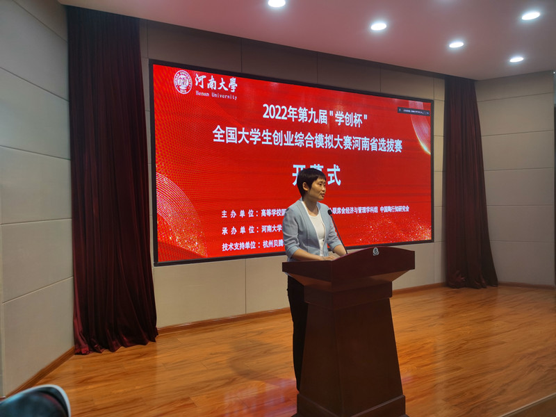 5月28日上午,第九届“学创杯”全国大学生创业综合模拟大赛开幕式在我校金明校区商学院二楼报告厅举行,校党委常委、副校长冯淑霞,就业创业指导中心、商学院、欧亚国际学院等相关单位负责人在现场参加开幕式。开幕式由我校教务处副处长朱显峰主持。受疫情影响,杭州贝腾科技有限公司高校事业部销售总监马姗姗女士,以及全省70多所高校的参赛选手及指导老师通过线上方式参加开幕式。