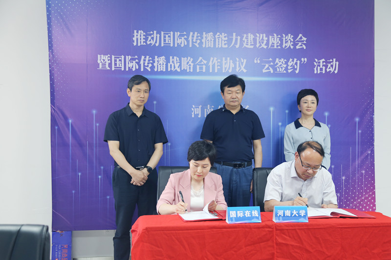 在蔡新民、杨瑞、陈连富的见证下,王明钦与高桠分别代表河南大学与国际在线,签署了国际传播战略合作。双方将携手实现资源共享,在网络国际传播理论与实务、国际传播人才培养、产学研结合及信息与技术资源共享等方面开展深入合作,不断加强国际传播能力建设,共同致力于向全球讲好河南故事,传播好中国声音,展示真实、立体、全面的中国。
