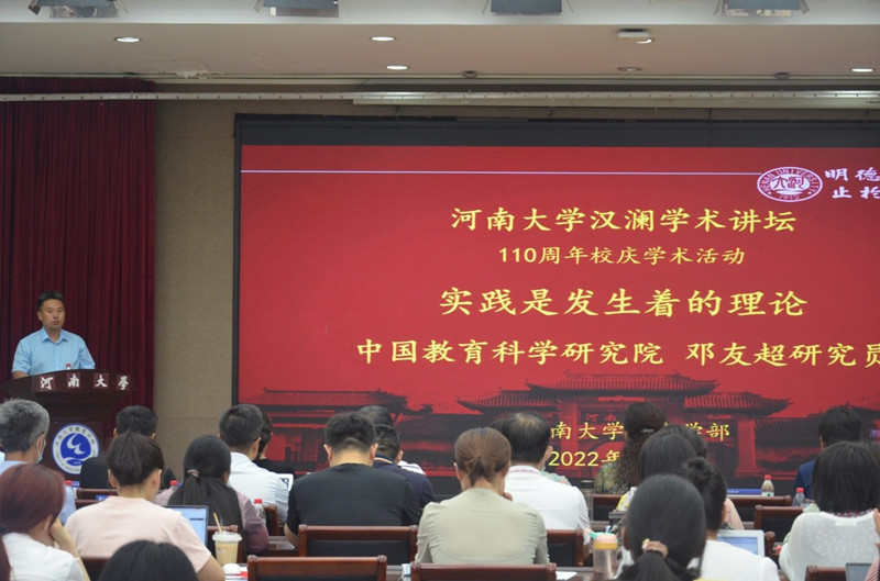 6月9日下午,作为河南大学110周年校庆系列学术活动重要内容之一,中国教育科学研究院研究员、《教育研究》总编邓友超应邀作客“河南大学汉澜学术讲坛”,作题为“实践是发生着的理论”的学术报告。报告会通过线上线下结合的方式进行,由教育学部副部长、教育学院院长王振存教授主持。