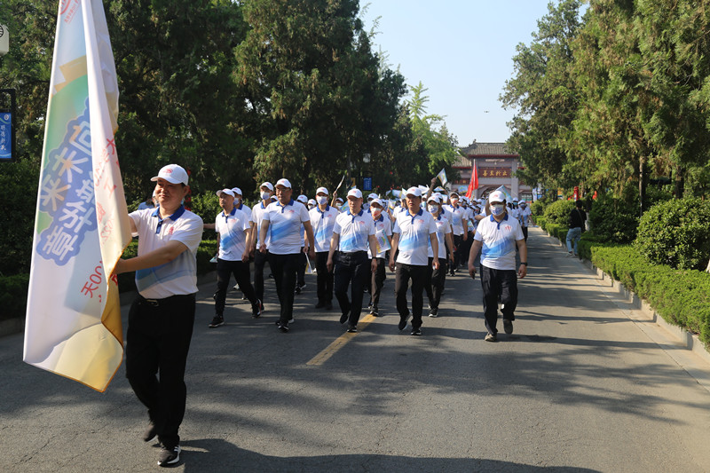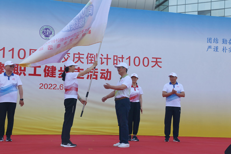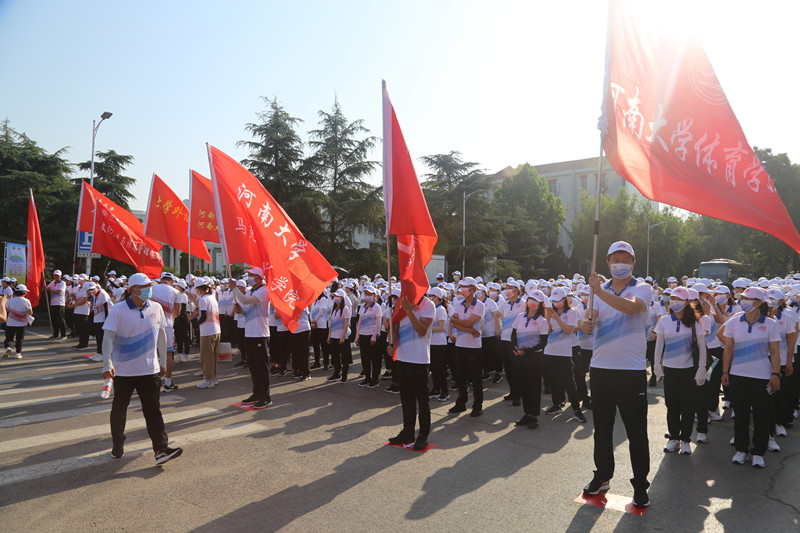 在大家热烈的掌声中,张锁江向明伦校区旗手代表、《河南大学学报》编辑部主任、主编李伟昉授旗;在健步行走路线起点处,张锁江宣布活动正式开始。“勠力同心、共建一流,接续奋斗、再创辉煌!”各单位方阵高喊活动口号,沿着既定路线有序前进。整齐统一的服饰着装、炎热天气下依然绽放的笑脸,展现了河南大学教职工团结向上的精神风采。