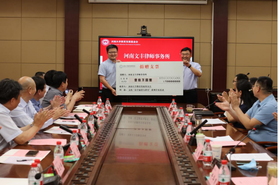 6月17日下午,河南文丰律师事务所、北京华泰(郑州)律师事务所、河南辽源律师事务所、北京康达(郑州)律师事务所向河南大学教育发展基金会捐赠仪式在法学院第一会议室举行,四家律所每所捐赠10万元定向用于法学院开办“文丰法学前沿大讲堂”“华泰法律实务大讲堂”“辽源明德法政大讲堂”“康达法学名家大讲堂”。校党委常委、纪委书记、省监察委驻河南大学监察专员杨朝阳,四家律师事务所主任和律师代表,河南大学教育发展基金会副秘书长唐胜,法学院领导班子成员和师生代表参加捐赠仪式。仪式由法学院党委副书记吴瑷瑷主持。