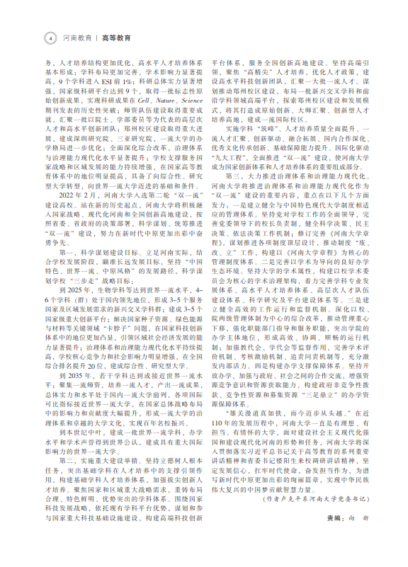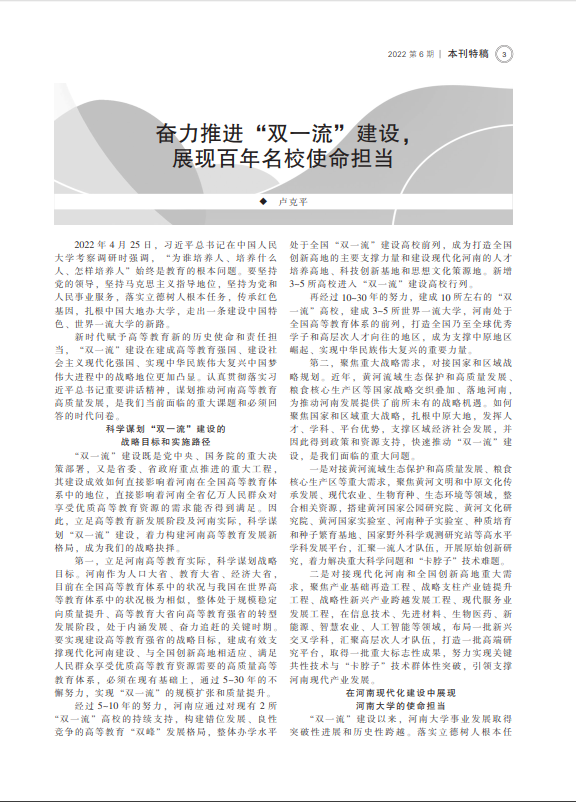 近日,《河南教育(高等教育)》杂志2022年第6期,刊发我校党委书记卢克平署名文章《奋力推进“双一流”建设,展现百年名校使命担当》。