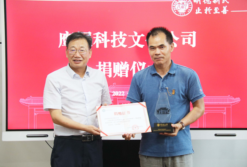 校党委副书记张宝明在致辞中向河南鹰展科技及中文系90级校友捐资50万元用于文学院事业发展表示感谢。他表示,今年既是河南大学建校110周年,又是第二轮“双一流”建设的开启之年,是落实省委省政府打造河南高等教育“双航母”战略的关键之年。文学院历史悠久,人才辈出,近年来在师资队伍、学科建设等方面做出了引人瞩目的成绩。最近,文学院中国语言文学学科进入学校重点建设的一流学科倍增学科,并即将迎来百年院庆,文学院的发展遇到了前所未有的良好机遇。他指出,学院的发展离不开广大校友和社会各界的鼎力支持。河南鹰展科技有限公司、90级中文系校友长期以来关注母校发展,设立了鹰展文化奖励基金、“一九九零文学奖”等多项基金,先后捐赠数额达200万元。今天再次捐赠50万元用于支持文学院事业的发展,充分体现了河大学子对母校的挚爱,更体现出90级中文校友们的无私奉献和社会担当。希望文学院管好、用好这笔经费,激发师生踔厉奋发、改革创新,为学校“双一流”建设贡献智慧力量,为河南大学110周年华诞和文学院100年院庆增光添彩。