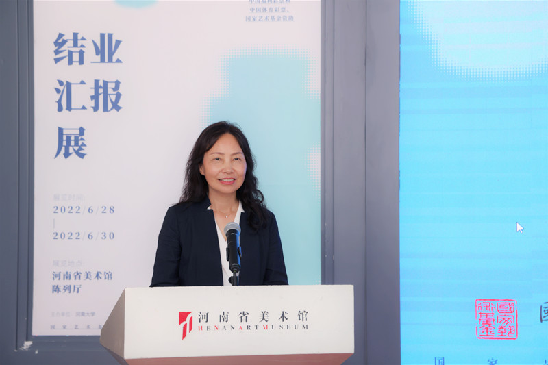 石品致辞。他首先代表河南学校艺术教育协会向国家艺术基金长久以来对河南省高校艺术人才发展培养的关注与支持表示感谢,并对河南大学美术学院此次项目的结业汇报成果表示祝贺。他说到,本次项目是高校积极响应习近平总书记关于“弘扬中华优秀传统文化”号召的有力践行,同时也充分体现出河南大学在新时代弘扬文化自信中的使命与担当。这次项目的完成与展示将为河南高等艺术教育界带来更多有益的学习与借鉴。