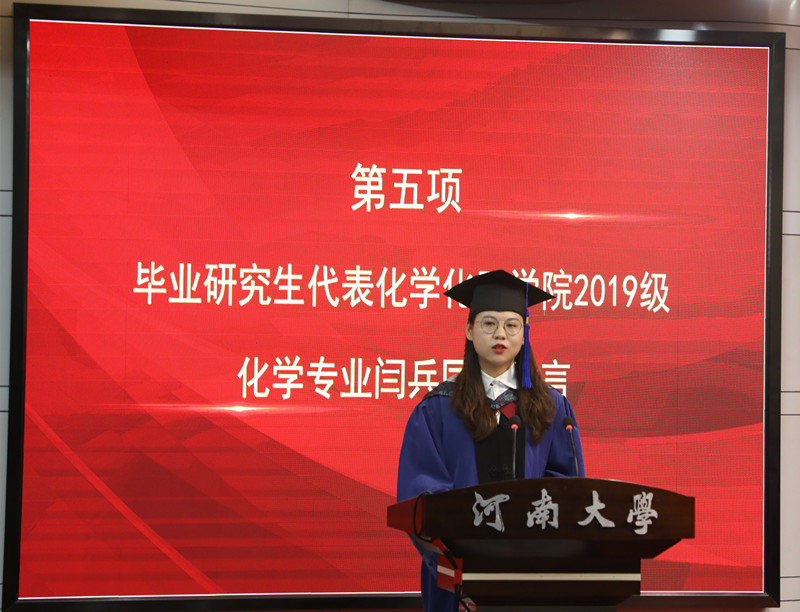 “我们将从河大启程,请老师放心,请母校放心,我们必将传承家国情怀,把个人理想融入国家和民族的事业中,肩负起时代赋予的使命与责任,让青春在磨砺中出彩,在奋斗中升华!”临别之际,研究生毕业生代表、化学化工学院闫兵在发言中表达了对母校的感恩、祝福和对未来的期盼。
