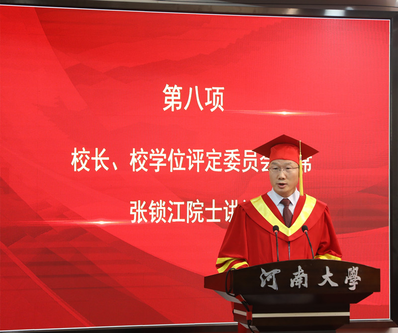 就职校长以来第一次参加学生毕业典礼的张锁江院士以“传承创新精神 创造美好未来”为题为研究生毕业生们上了在河大的“最后一课”。他首先代表学校向2022届全体研究生毕业生表示热烈祝贺,回顾了这届毕业生在疫情之下不寻常的读研历程,勉励同学们在未来人生道路上“要树立远大理想,胸怀家国天下,立志成为国之栋梁;牢记国家重托,勇担时代责任,争做创新发展的生力军;学会独立思考,加强个人修养,争做创新文化的引领者”,号召同学们传承河大人的使命,将爱国之情化为报国之志,为国家需求、人民福祉、人类进步奉献智慧与才干;适应新一轮科技革命和产业变革给社会生活带来的冲击与挑战,充分发挥在校期间掌握的知识优势,立志成为科技创新的生力军和科技体制变革的引领者;坚持独立思考、独立人格,用良好个人修养助力科学攀登,在新的人生道路上继续保持追求卓越的创新精神,真正担当起弘扬科学精神的社会责任。张锁江引用青年毛泽东在《湘江评论》上的创刊词激励同学们做一个坚定而执着的追梦人,朝着梦想的方向奋力奔跑,努力跑出最好成绩。“无论是明伦街85号,还是明理路379号,母校永远是你们的精神家园,永远是你们的坚强后盾,随时欢迎你们回来,歇歇脚、叙叙旧、充充电。”张锁江充满正能量的谆谆叮嘱赢得同学们热烈的掌声。