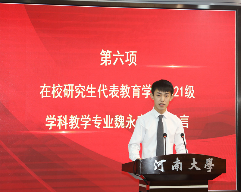 相逢又别离,归帆又离岸。“感谢你们为我们留下了宝贵的精神财富,我们一定同你们一样认真踏实、勤勉刻苦,在河南大学良好的育人氛围下,用我们的实际行动为母校的发展进步贡献青春和力量!”在校研究生代表、教育学部魏永康在发言中回顾了和学长学姐们一同渡过的美好年华,依依不舍和深情祝愿溢于言表。