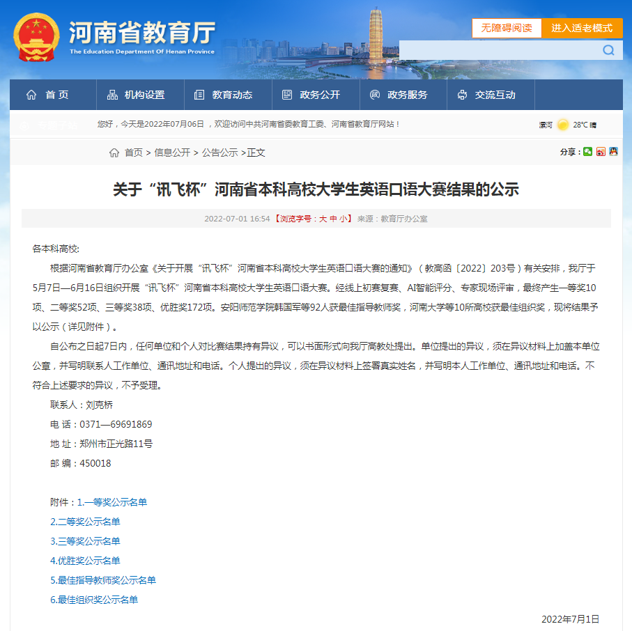 根据河南省教育厅办公室《关于开展“讯飞杯”河南省本科高校大学生英语口语大赛的通知》(教高函〔2022〕203号)安排,河南省教育厅于5月7日—6月16日组织开展“讯飞杯”河南省本科高校大学生英语口语大赛。此次大赛由外语学院与大学外语教研部共同组织。外语学院2020级学生富楠曦,2018级学生郭雨杰和张心怡,文化产业与旅游管理学院2021级学生罗逸琪,临床医学院2020级学生张燕亭五位选手精心备战,代表河南大学进入省赛。