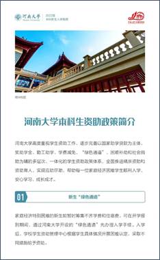 据悉,为方便广大学生及家长及时准确了解国家资助政策和学校特色资助措施,我校学生资助管理中心于6月20日开通了学生资助热线电话,为家庭经济困难学生答疑解惑、排忧解难。为帮助每一位家庭经济困难新生顺利入学,学生资助管理中心还精心编写了《河南大学本科生资助政策简介》和《河南大学本科生资助政策明白卡》,连同河南省教育厅印制的《国家资助,助你飞翔》《河南省家庭经济困难学生认定申请表》等材料一起,交由学校招生办公室随同录取通知书一并寄送给每一位录取新生,确保每一位新生在入校前就能了解各级各类资助政策并做好申请准备,确保不让一名学生因家庭经济困难而失学。