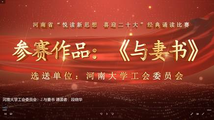 校工会高度重视本次经典诵读比赛,广泛动员、认真组织;承办单位工会教职工教育工作委员会、文学院工会从60多件诵读作品中精心筛选,评委专家认真指导,最终取得了优异的成绩。《念奴娇·追思焦裕禄》由党委办公室王娇娇、新闻与传播学院栗江豪两位老师诵读,深情怀念了党的好干部焦裕禄同志;《与妻书》由文学院段晓华老师诵读,将革命烈士林觉民高尚的家国感情表达得淋漓尽致、感人至深。在喜迎党的二十大胜利召开、纪念焦裕禄同志诞辰100周年、庆祝河南大学建校110周年之际,我校选送的作品深情歌颂了党的丰功伟绩,赞美了中华儿女奋勇拼搏的民族精神,诠释了焦裕禄精神在河南大学的传承和弘扬,展示了我校工会会员在“双一流”建设的新征程中扬帆再航、争创一流的昂扬向上精神风貌。