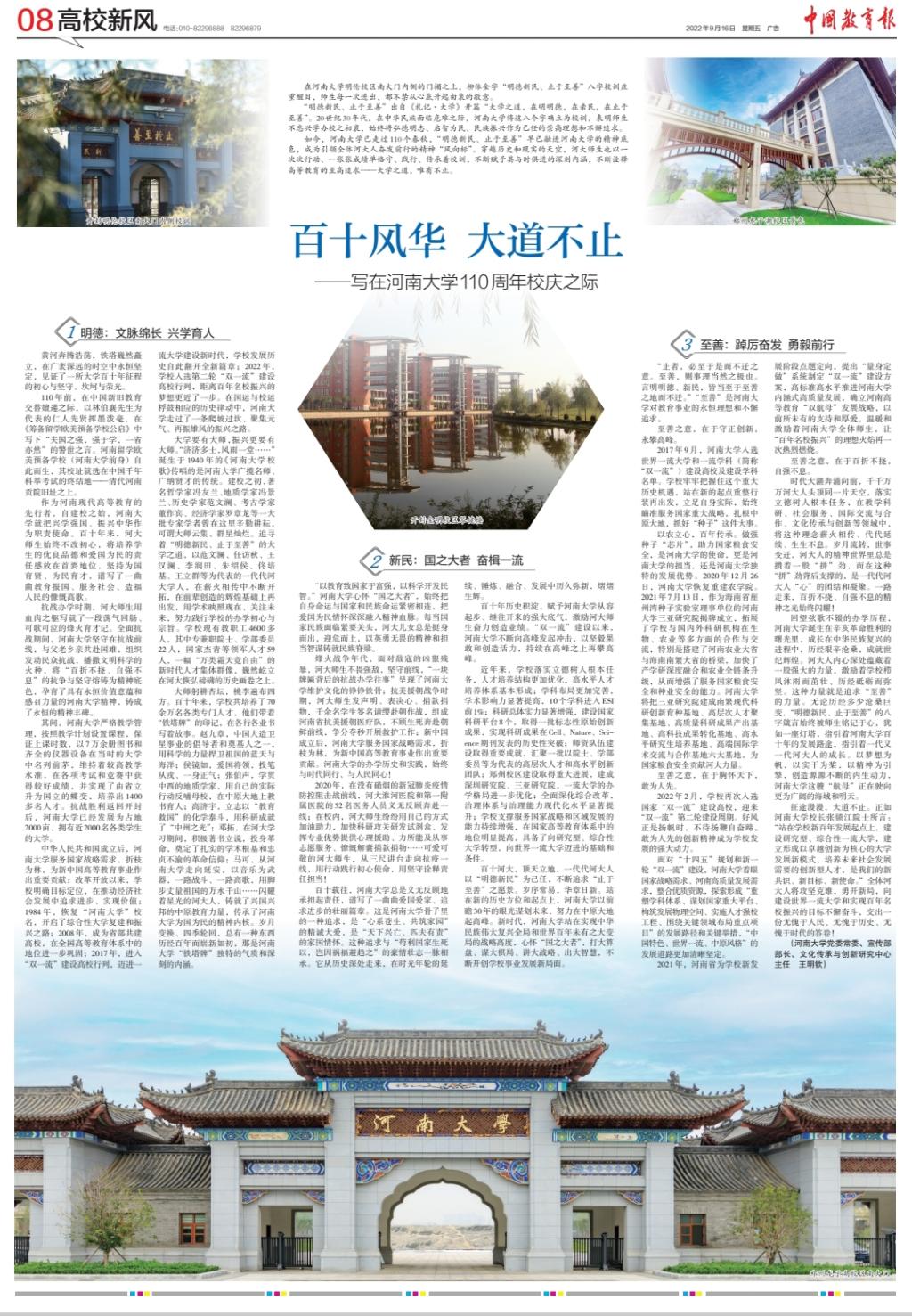 征途漫漫,大道不止。正如河南大学校长张锁江院士所言:“站在学校新百年发展起点上,建设研究型、综合性一流大学,建立形成以卓越创新为核心的大学发展新模式,培养未来社会发展需要的创新型人才,是我们的新共识、新目标、新使命。”全体河大人将攻坚克难,勇开新局,向建设世界一流大学和实现百年名校振兴的目标不懈奋斗,交出一份无愧于人民、无愧于历史、无愧于时代的答卷!