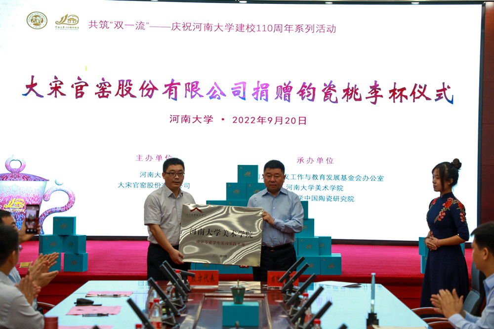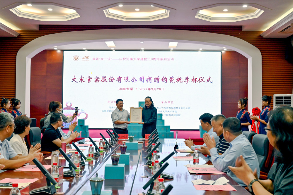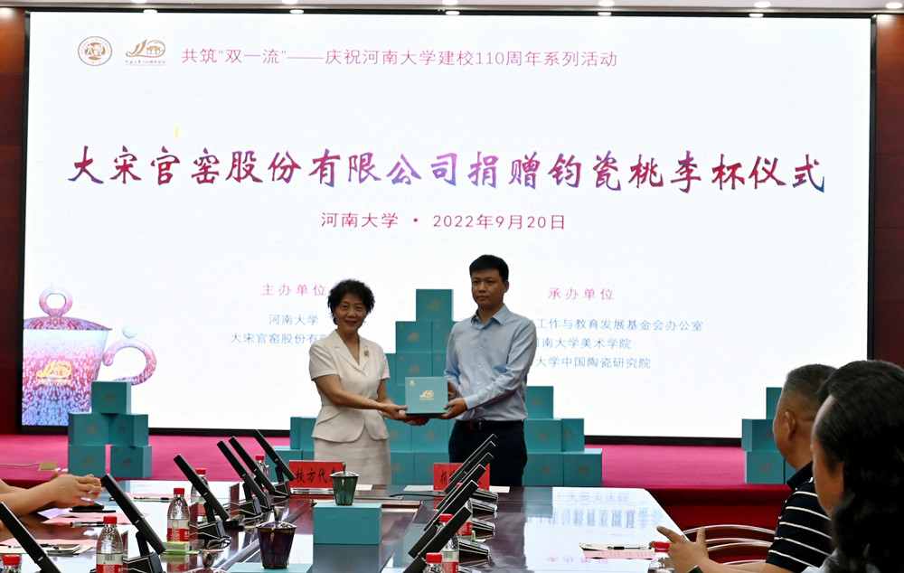 苗峰伟表示,本次捐赠的2000套“桃李杯”钧窑作品,是以河南大学110周年校庆主题创意设计的。河南大学根植中原沃土,培养的“铁塔牌”学子犹如钧窑烧制中的窑变,每一件“作品”都是天下无双的栋梁之材。钧瓷在中国文化发展中具有重要的历史价值,陶瓷文化的传承与创新是时代命题,他希望通过与河南大学的深入合作,共同实现新时代中原陶瓷文化的新发展。