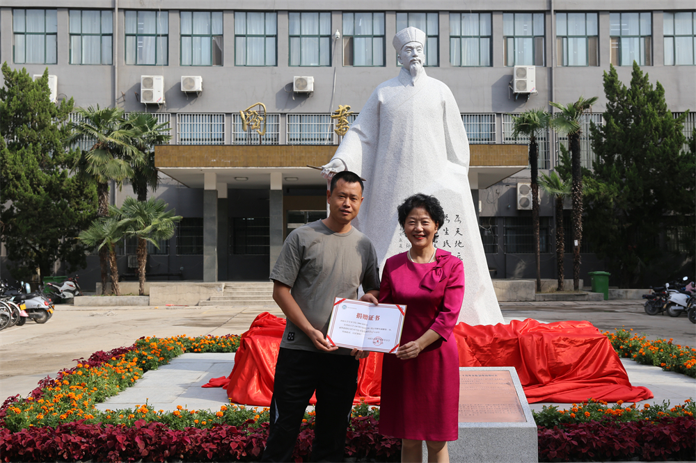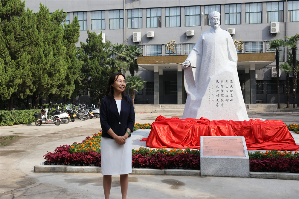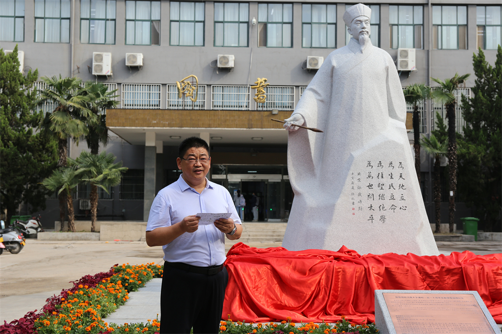 谭贞代表学校向美术学院2004届校友们情系母校发展,关心、支持母校建设之举表示感谢。她说,在原校长宋纯鹏的提议下,河南大学教育发展基金会、美术学院与美术学院2004届的广大校友们紧密合作,历时一百三十余天,最终将设想变成现实,成就了这尊矗立在逸夫图书馆前3米多高的花岗岩雕像,成为明伦校区一道新的亮丽的人文景观。谭贞赞扬了张载雕像的恢弘气势,认为其体现了张载“为天地立心,为生民立命,为往圣继绝学,为万世开太平”的精气神,这种精气神也始终鼓舞着百年来的河大师生砥砺奋进。张载雕像凝聚着校友们对母校的拳拳之心,也必将见证河南大学在新百年的蓬勃发展。