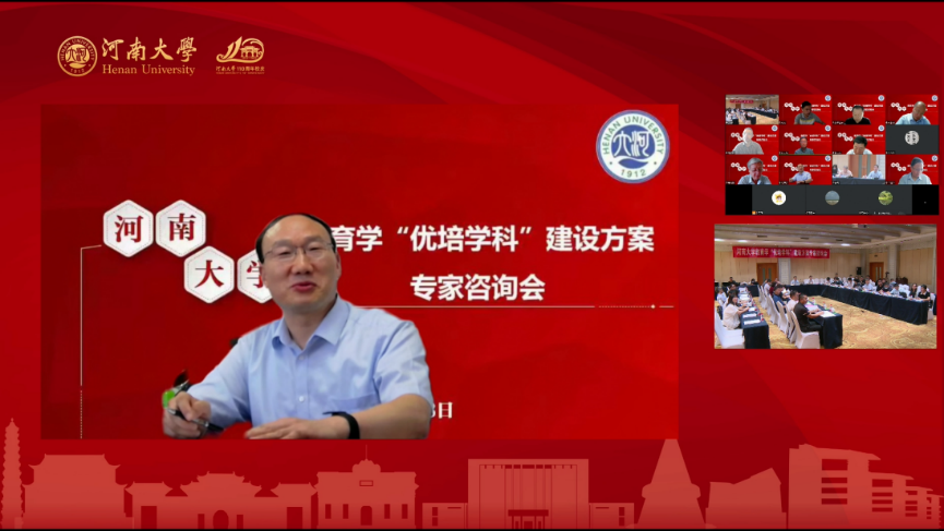 第二阶段是专家咨询阶段,专家咨询通过线上、线下结合方式进行,线上由钟秉林教授主持,线下由别敦荣教授主持。钟秉林代表专家组向河南大学110周年华诞表示祝贺,向河南大学和河南大学教育学部的邀请表示感谢!并表示将继续关注河南大学、河南大学教育学科的建设与发展,祝愿河南大学早日建成一流大学、河南大学教育学科早日成为一流学科。