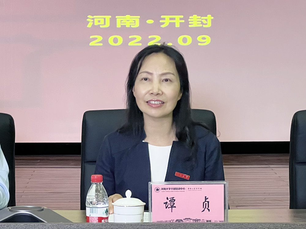 谭贞代表河南大学致欢迎辞。她表示,在全国上下喜迎党的二十大胜利召开之际,省委教育工委、省教育厅领导统筹疫情防控和事业发展,适时启动和举办本期培训班,充分体现了对我省高等教育事业和高校干部队伍建设的高度重视,对高校中青年干部成长的关怀厚爱。她指出,今年是河南大学建校110周年和河南省高校干部培训中心成立35周年,一定要把本期培训班办实办好、办出特色,教育引导全体学员围绕服务“十大战略”、实现“两个确保”不断提高办学治校能力,为中原更加出彩贡献更多智慧力量。