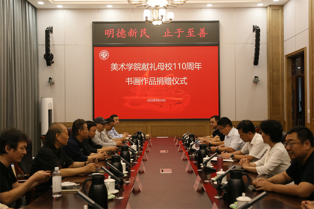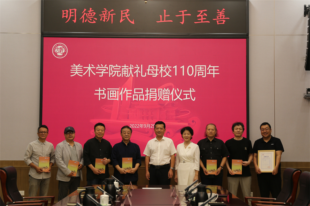 9月29日上午,美术学院献礼母校110周年书画作品捐赠仪式在郑州龙子湖校区友兰学堂举行。校党委常委、副校长孙功奇,教育发展基金会秘书长刘波,龙子湖校区建管委常务副书记、龙子湖校区综合管理办公室主任乔梁,龙子湖校区建管委副主任左辞波、王波、张俊伟,河南省书法家协会顾问、原河南大学艺术学院院长赵振乾,河南省美术家协会顾问、河南省意笔人物画艺委会主任袁汝波,美术学院党委书记杨江涛、学术委员会主任彭西春等到场参加。仪式由杨江涛主持。