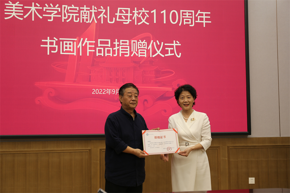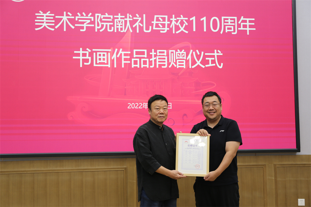 随后,袁汝波代表艺术家向龙子湖校区建管委常务副书记乔梁捐赠作品,刘波代表教育发展基金会向捐赠作品的艺术家们依次颁发捐赠证书。