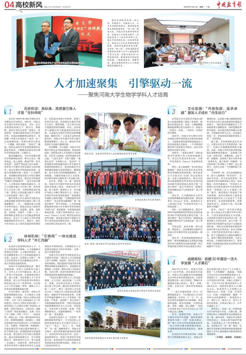 河南大学生命科学学院党委书记吴建伟介绍说:“我们在人才引进机制上是十分顺畅、高效的,往往在人才有意向加盟时,我们就同步考虑并着手统筹校内资源为其搭建平台、组建团队及谋划进一步发展,缩短引进人才的适应期,为其引领、带动年轻教师冲击世界科技前沿阵地提供稳固保障。”