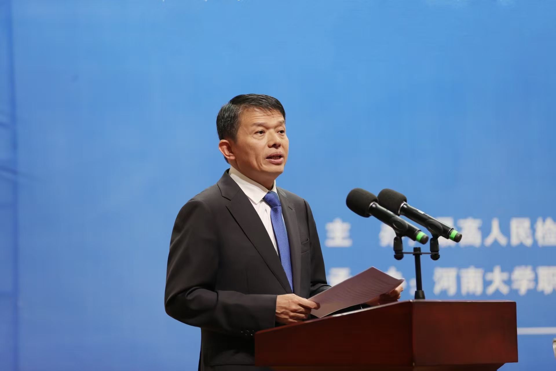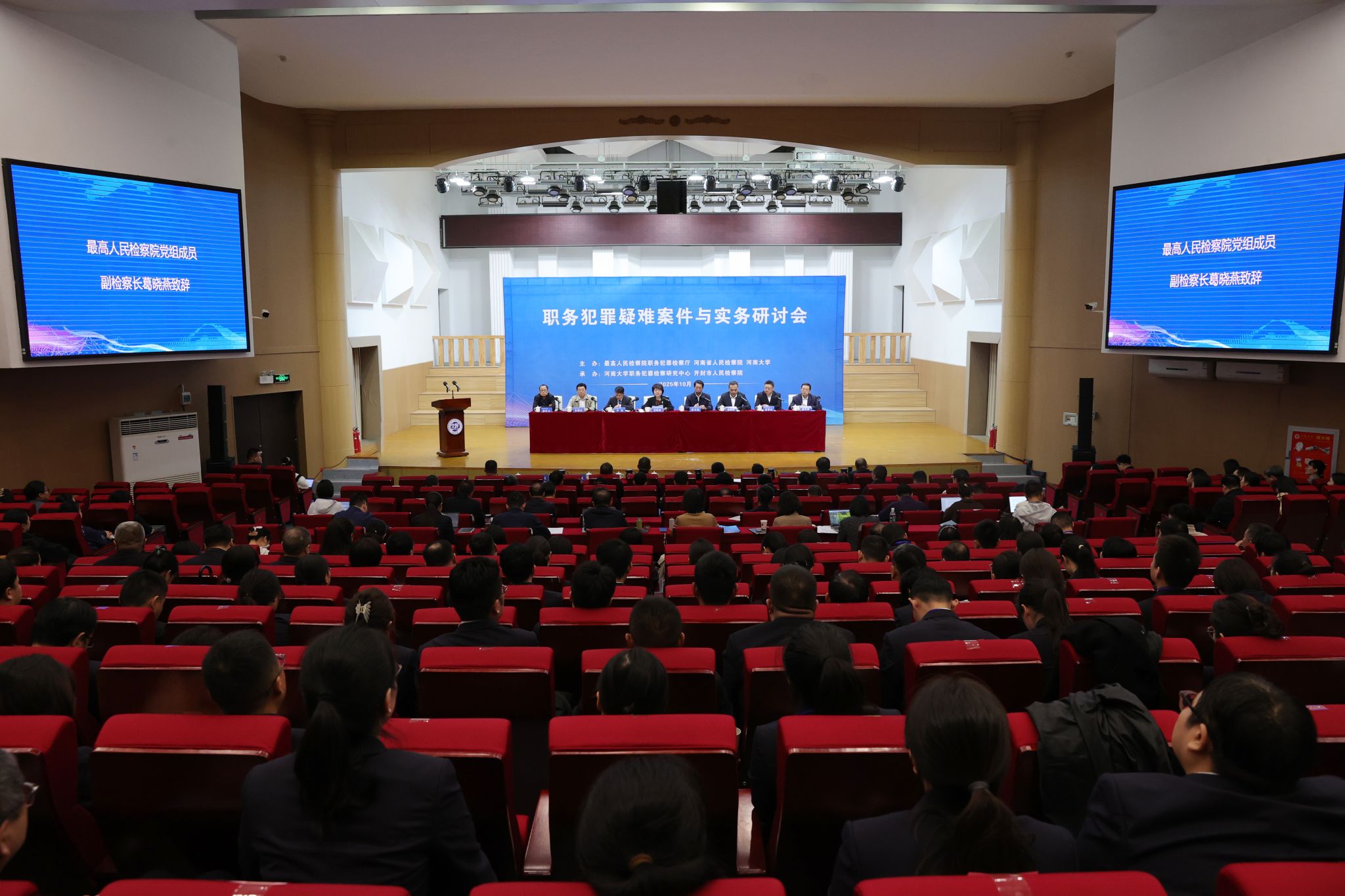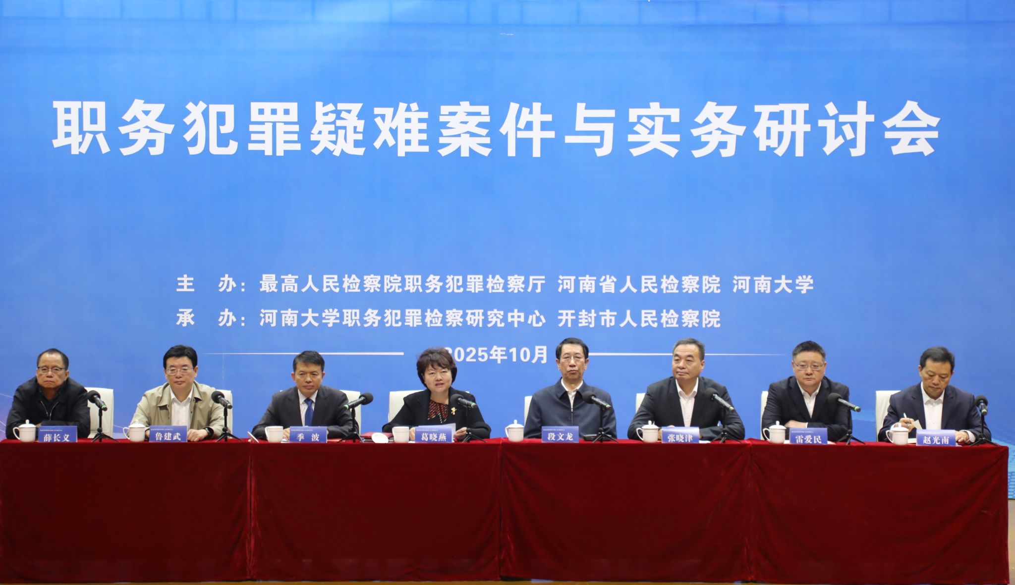 10月17日,“职务犯罪疑难案例与实务研讨会”在我校明伦校区举办。最高人民检察院党组成员、副检察长葛晓燕,河南省人民检察院党组书记、检察长段文龙出席并致辞,上海市高级法院党组书记、院长,中国刑法学研究会会长贾宇视频致辞。校党委书记季波出席并致辞。最高人民检察院检委会委员、职务犯罪检察厅厅长张晓津主持。本次研讨会以“从个案到规则——职务犯罪办案中的守正创新”为主题,由最高人民检察院职务犯罪检察厅、河南省人民检察院与河南大学共同主办,河南大学职务犯罪检察研究中心与开封市人民检察院联合承办。