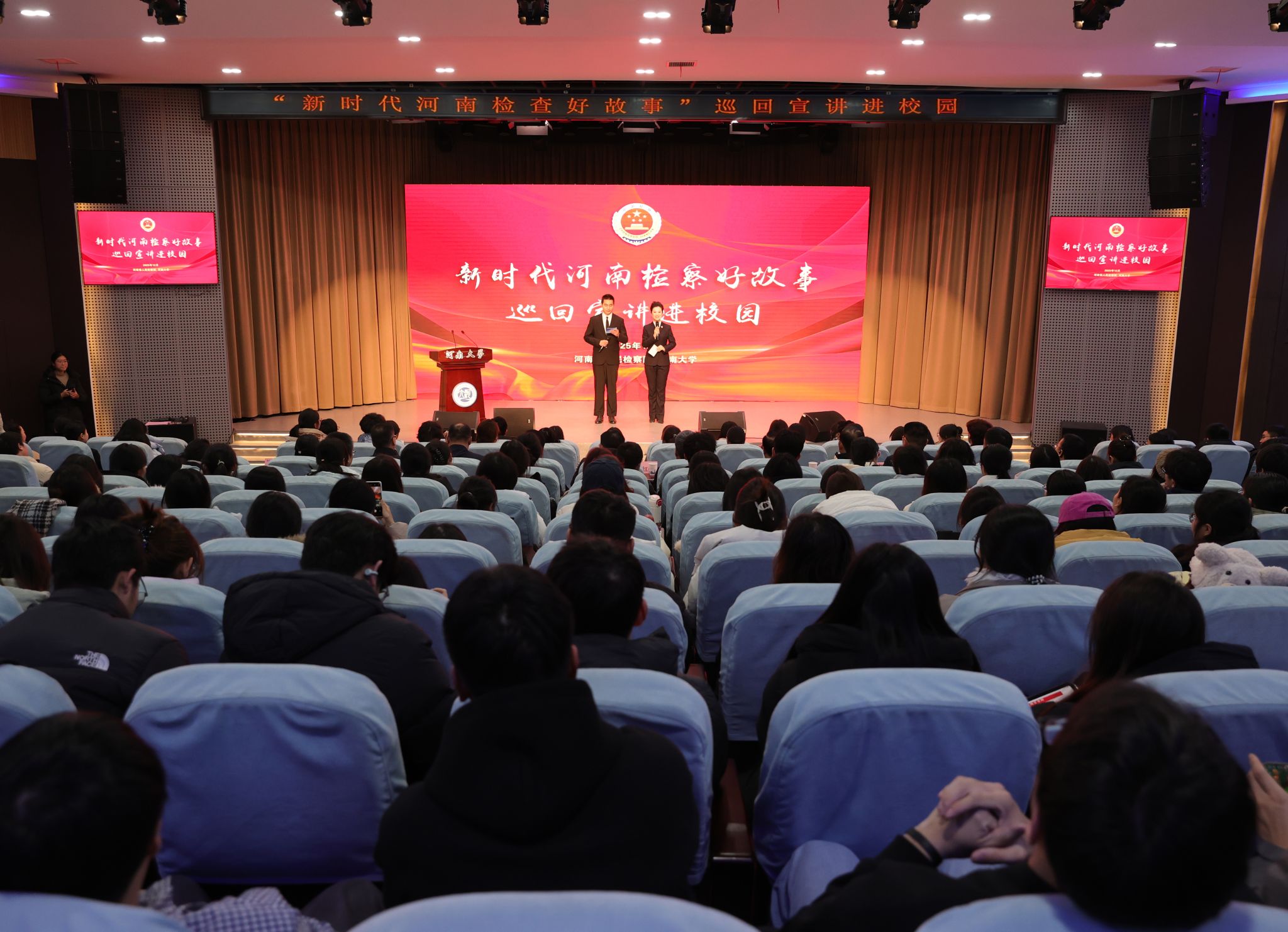 12月24日晚,“新时代河南检察好故事”巡回宣讲活动于河南大学明伦校区科技馆二楼报告厅举行。河南省人民检察院检委会专职委员李红伟,河南省人民检察院政治部宣传处处长刘立新,副处长李达、陈朝东,河南大学党委副书记李平,党委宣传部部长姬志闯出席活动,法学院班子成员及师生代表近300人共聚一堂,聆听法治前沿的动人篇章。