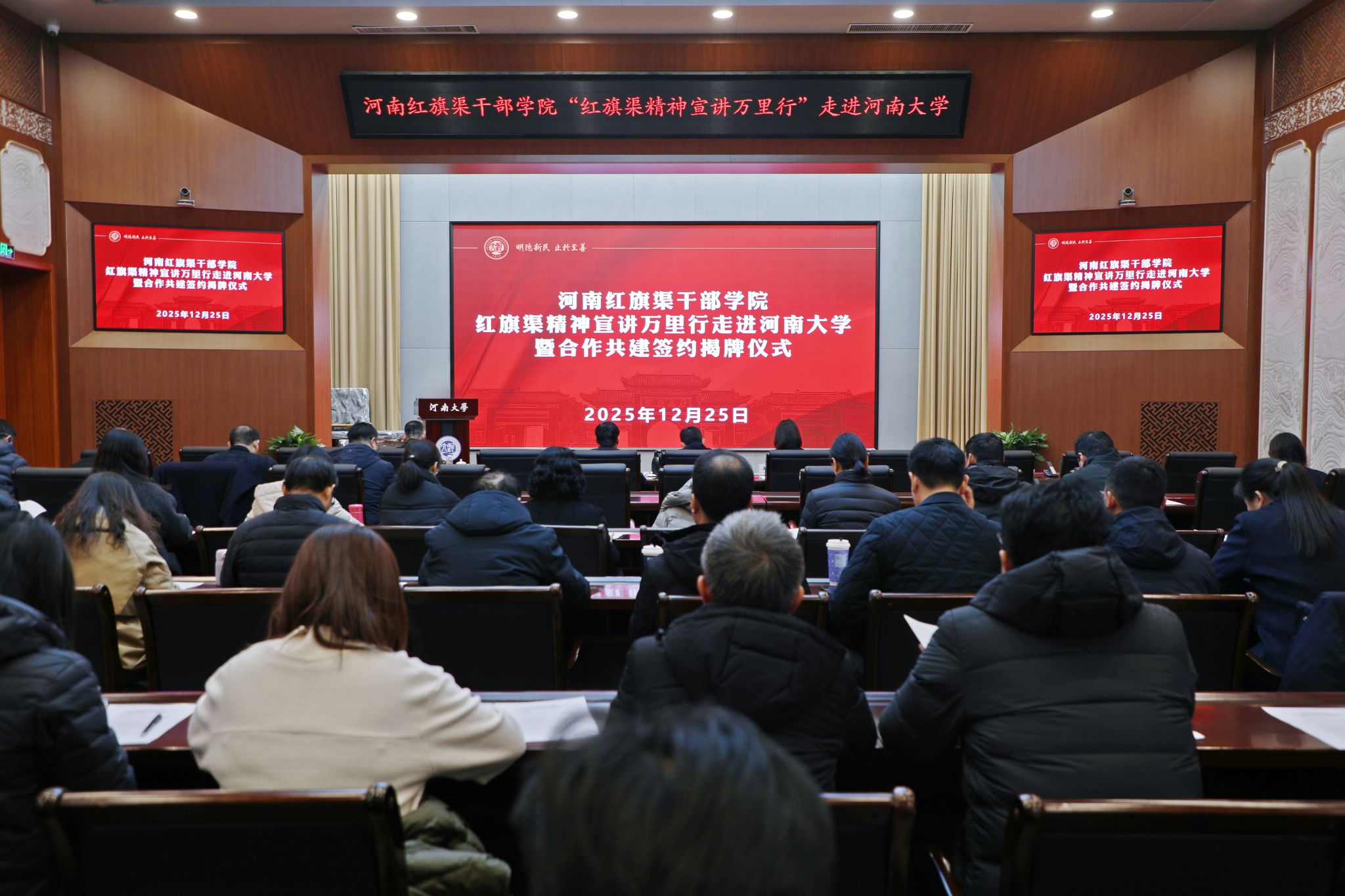 为深入贯彻落实习近平总书记视察河南重要讲话精神,推动党的二十届四中全会精神走深走实,12月25日下午,红旗渠精神宣讲万里行走进河南大学暨合作共建签约揭牌仪式在郑州龙子湖校区友兰北楼举行。河南红旗渠干部学院党委副书记、常务副院长鲁红杰带领20余名宣讲团教师来校宣讲,河南大学党委副书记杨萌芽及各单位党委、党总支副书记,马克思主义学院教师代表、龙子湖校区师生代表共140余人齐聚现场,共同学习红旗渠精神。活动由校党委宣传部部长姬志闯主持。
