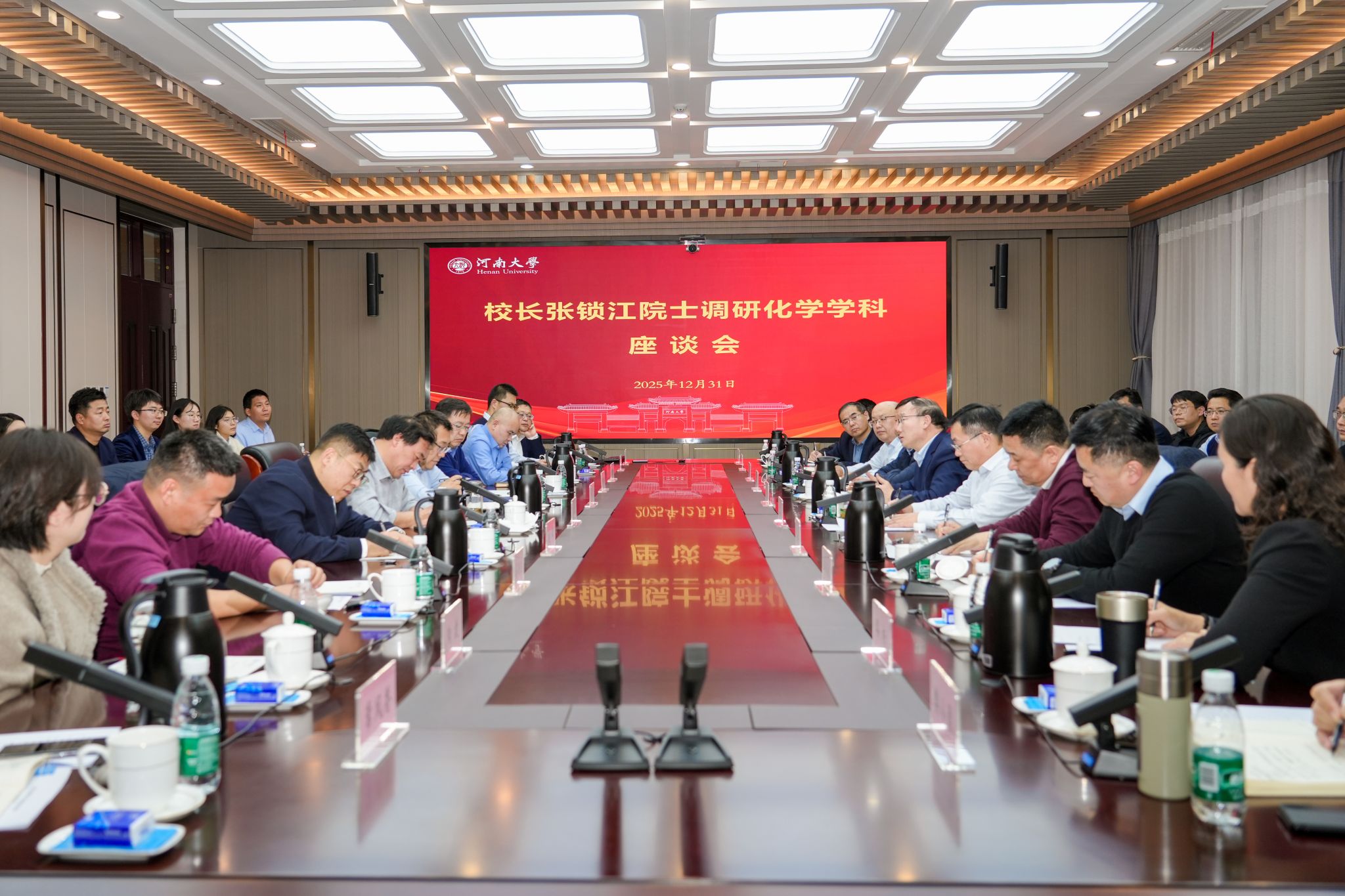 2025年12月31日,校长张锁江在郑州龙子湖校区专题调研化学学科建设发展情况。校党委副书记李平,副校长苗雨晨、乔梁、张礼刚、薛波,学术副校长陈雪波,相关职能部门负责人,化学科学部各单位主要负责人、国家级人才及师生代表参加调研。