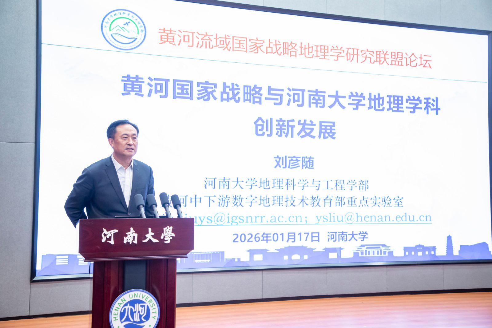 主旨报告环节,发展中国家科学院院士、河南大学学术副校长兼地理科学与工程学部主任刘彦随以“黄河国家战略与河南大学地理学科创新发展”为题,系统梳理了河南大学地理学部建设和学科发展进展,包括创建地理学科“36X”体系、地理科学—技术—工程—实践(Geo-STEP)四维融通范式,以及科教融合理工结合、校地联合的“三合一体”长效机制,率先成立地理工程系和新设地理工程学博士、硕士授予学科方向,成功共建空间基准全国重点实验室等科研平台,实施“黄河流域气候适应性人地系统耦合与智慧规划”学科引智工程计划。新年伊始,多家单位共同发起“黄河流域国家战略地理学研究联盟”,旨在突出地域特色,充分发挥学科优势,创建多部门共享共赢平台,为服务黄河国家战略提供理论支撑和决策支持。