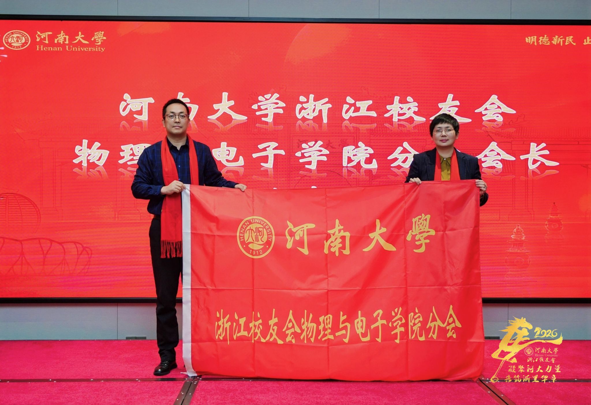 1月24日,河南大学浙江校友会新年团拜会暨换届大会、物理与电子学院分会成立大会在杭州湾大酒店举行。河南大学副校长白莹一行与来自浙江各地的300余名河大校友欢聚一堂,共叙同窗情谊、共话母校发展、共绘美好蓝图。