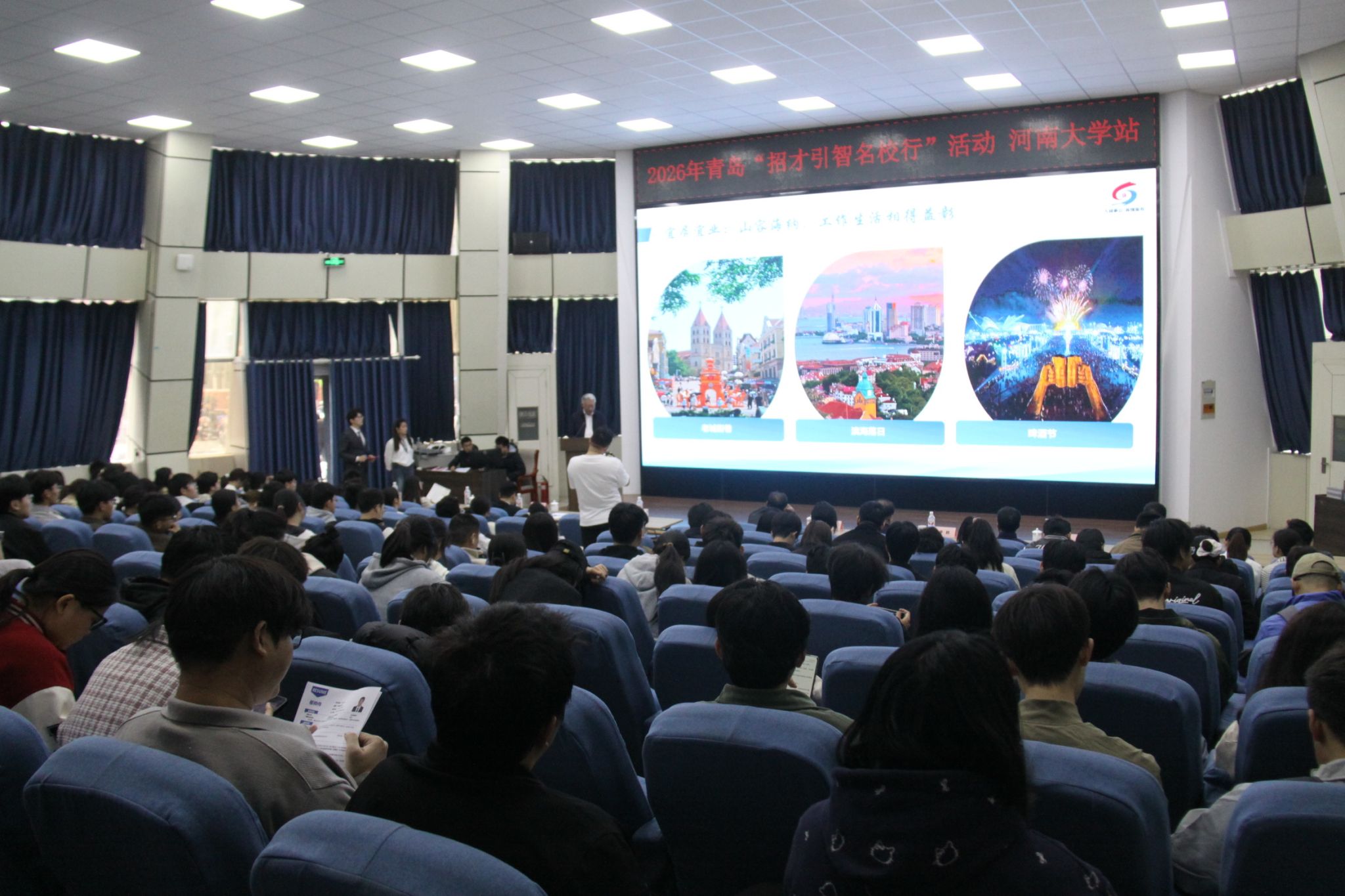 4月9日,2026年青岛市“招才引智名校行”河南大学推介活动在金明校区锥形报告厅举办。河南大学陈雪波教授,青岛市委组织部副部长、市人力资源社会保障局党组书记、局长刘学俊,青岛市公共就业和人才服务中心党委书记、主任高杰出席活动。青岛市人社系统相关负责同志、我校就业创业指导中心及各学院相关负责人、师生代表参加活动。