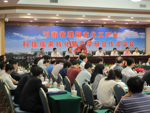 5月16日上午,濮阳市化工产业科技成果转化暨产学研合作洽谈会在濮阳迎宾馆举行。来自中科院、省科学院及中国石油大学、天津大学等近30家高校和科研院所的领导、专家参加了此次洽谈会。受濮阳市政府邀请,我校常务副校长赵国祥在校产办、科研处及化学化工学院有关负责人陪同下与会并与濮阳市副市长、河南大学校友邹东波签署了“濮阳市人民政府、河南大学科技合作协议书”。