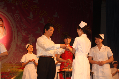 娄源功等领导为即将毕业的“准护士”授帽传光,“准护士”们从老师手中接过象征着人道主义精神的蜡烛后,举起右手,郑重地许下了自己将为护理事业奋斗终身的誓言。
