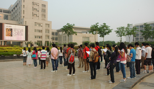 5月4日清晨6点30分,我校百余名学子聚集在金明校区马可广场的大屏幕前,齐声诵读《礼记》之《大学》篇,为2012河南大学读书月系列活动拉开了帷幕,并以这种独特的方式纪念五四青年节,图书馆党总支书记郭鸿昌等现场指导晨读活动。