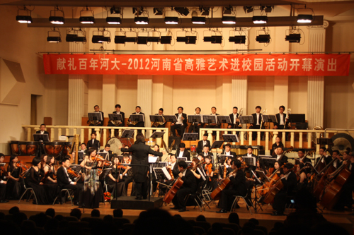 4月18日晚,由河南省教育厅、文化厅、财政厅牵头举办的“献礼百年河大——2012河南省高雅艺术进校园活动开幕演出”在我校艺术学院音乐厅举行。河南省教育厅副巡视员刁玉华,河南省学校地方教育协会会长石品,河南歌舞演艺集团总经理张振中,河南省教育厅体卫艺处处长郭蔚蔚,中国高等教育学会音乐教育专业委员会副理事长李以明,河南歌舞演艺集团副总经理、国家一级指挥吴涛,我校党委副书记王凌以及校党委宣传部、学生工作部、校团委等相关部门负责人和现场观众一同欣赏了这场视听盛宴。