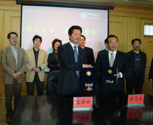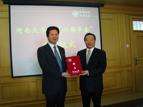 2012年4月11日上午,我校在新行政楼二楼会议室举行程道兴兼职教授聘任暨河南大学道兴奖学金启动仪式。校长娄源功,兴亚集团董事局主席程道兴一行7人出席聘任仪式。教育发展基金会等单位负责人参加了聘任仪式。