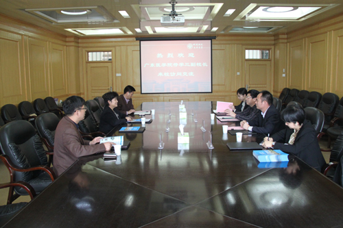 2012年4月10日上午,广东医学院副院长符学三一行4人来校,就高层次人才引进与培养问题进行访问交流。校党委副书记王凌,党政办公室、党委研究生工作部等部门负责人与客人们进行了座谈。