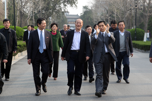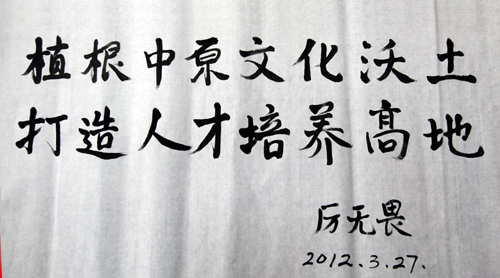 报告会开始前,我校常务副校长赵国祥为厉先生颁发了河南大学特聘教授聘任证书。报告会结束后,厉无畏先生在我校有关领导陪同下,参观了明伦校区和校史馆,并欣然题词:植根中原文化沃土,打造人才培养高地。