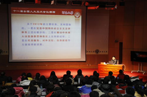 关爱和介绍了十一届全国人大五次会议召开的盛况,就胡锦涛总书记在“两会”党员负责人会议上的重要讲话精神,政府工作报告、贺国强同志参加河南代表团审议时的重要讲话精神等进行了传达,同时,结合河大百年校庆,关爱和进一步为同学们阐述了河大精神,强调要以百年校庆为契机,在继承和弘扬河大精神的基础上,不断实现自身的创新和突破。关爱和的报告朴实生动、风趣幽默,现场气氛热烈、掌声不断,使在座的同学们深受鼓舞!