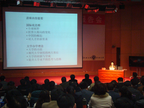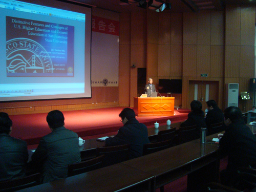 为拓宽国际办学视野,推进我校的国际化进程,3月20日下午,美国加州州立理工大学商学院林连连教授和美国旧金山州立大学副校长吴彦伯教授应邀在我校金明校区计算机大楼二楼报告厅相继作了精彩的学术报告。校领导赵国祥、王凌、朱恒宽等出席报告会。学校全体中层干部和干部培训班学员共同聆听了报告。报告会由常务副校长赵国祥主持。