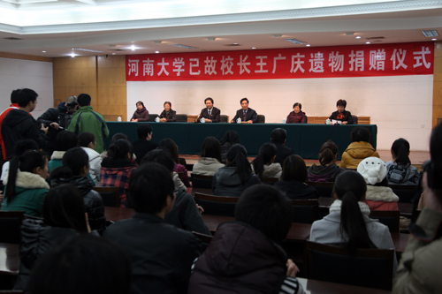 娄源功对王广庆先生为河南大学所做的贡献表示钦佩和敬意,对家属们给予学校的关心表示感谢。他说,抗日战争期间,王广庆临危受命,任职期间一直致力于学校的建设与发展,学校由省立升格为国立,在我校历史上留下了浓重的一笔。王广庆先生的遗物极具史料价值,对于丰富我校历史档案,缅怀、纪念王广庆先生及发扬百年河大艰苦办学的精神具有重要意义。