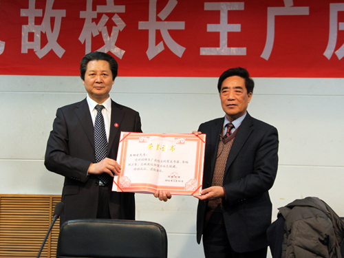 2012年3月15日下午,已故校长王广庆的家属将父亲生前的书籍、手稿、书法作品等遗物捐赠给我校。校长娄源功、校党委副书记王凌以及党委宣传部、校友总会、档案馆负责人和部分学生代表出席了在新行政楼第四会议室举行的遗物捐赠仪式。仪式由王凌主持。