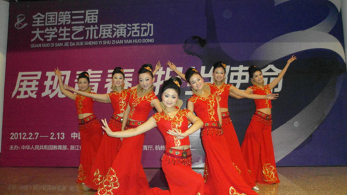 2012年2月7日-14日,全国第三届大学生艺术展演决赛在浙江杭州举行,我校在本届大学生艺术展演中成绩斐然,共获得全国一等奖6项、二等奖8项、三等奖2项和优秀组织奖,获奖数量位居河南省首位。其中,校党委副书记王凌的摄影作品《祈福》获本届大艺展校长风采奖;新闻与传播学院教师强海峰、谷小龙指导的校园剧《我要为你“织微博”》获戏剧类甲组一等奖第一名和优秀创作奖,是我校自参加此项赛事以来获得的最好成绩;艺术学院教师王凯歌、李玉昆指导的表演唱《河南迈向新征程》获得艺术表演类全国一等奖、优秀创作奖,并应邀参加了此次赛事的“青春大舞台”演出;由赵振乾、王梦笔、黄修珠老师指导,高玉鹏、曹琳同学的书法以及陈然同学创作的篆刻作品,袁汝波老师指导,杨素懿同学创作的绘画作品获艺术作品类全国一等奖。